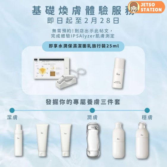 由即日起至2月28日,親臨門市出示此帖文,即可享基礎煥膚體驗服務,以 IPSAlyzer 專業皮膚分析儀分析肌膚狀態及膚質,由更了解肌膚需要開始,共同定制你的專屬基礎養膚三件套,完成體驗更可享水潤保濕潔面乳25ml!