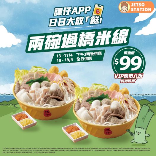 *VIP晚市八折優惠只適用於譚仔APP VIP會員 | 於譚仔APP成功註冊為會員並於連續90天累積消費滿HK$600,即可於翌日自動解鎖VIP 晚市八折優惠時段 | 折扣後的總價格如有小數位將以四捨五入至最近整數處理 | 推廣期為2026年4月13日至4月17日下午3時後供應,2026年4月18日至4月19日全日供應 (早市除外) | 優惠只適用於手機點餐之堂食及外賣自取服務 | 外賣包裝每個將收取1元 | 產品供應數量有限,售完即止 | 優惠詳情請參閱譚仔手機應用程式內資訊 | 優惠受條款及細則約束 | 圖片只供參考 | 實物及份量可能會有所不同