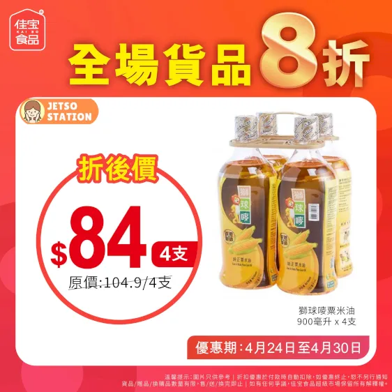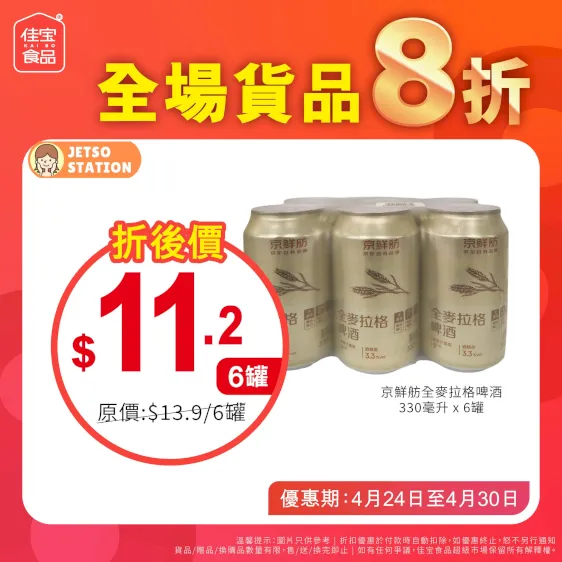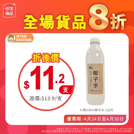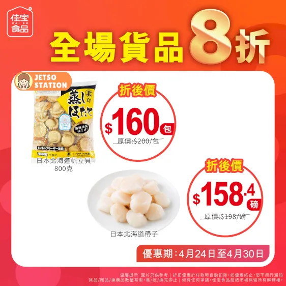 連續7日,佳宝全場貨品一律8折!佳宝同你慳到盡!新鮮蔬果、肉類海鮮、糧油雜貨、飲品啤酒!