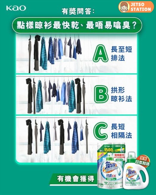 【晾衫,你真係識?】晾衫個個都識,但唔係人人都晾得出色。學識正確嘅晾衫方法,唔單止可以縮短晾乾時間,仲可以防止衣物滋生噏臭味。潔霸抗菌除噏臭洗衣液 無論點晾,都可以預防衣物噏臭。有效殺滅99%新型病毒*及99.999%細菌。洗後更喺衣物形式強效抗菌消臭保護層,晾衫密到1 cm 都唔臭!一於Share埋俾有衣物噏臭困擾嘅朋友,齊齊贏走奬品,洗走噏臭!Captain Attack考考你,圖中邊種晾衫方法最快乾、最唔易噏臭呢?答啱就有機會有贏走奬品!