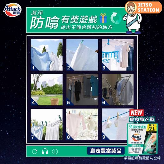 【#有獎遊戲 潔淨防噏解碼室】落雨有咩好怕?最怕就係焗住要室內密集晾衫,令屋企充滿揮之不去嘅噏臭味……召集各位防噏神探:即刻搵出下圖嘅噏味源頭,免費贏走 全新日本製#潔霸超濃縮殺菌洗衣棒 室内晾衣型!佢有效令衣物防噏長達96小時,晾衫從此安心「曬」!