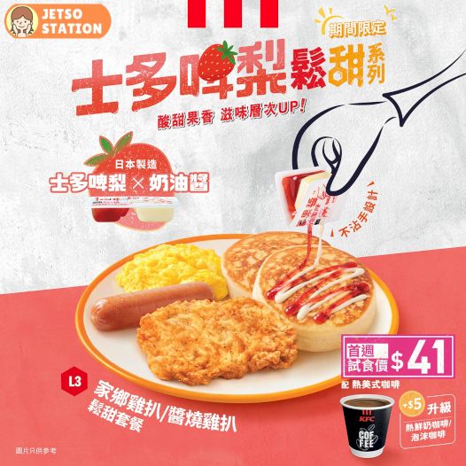 肯!鬆甜包系列加推「士多啤梨鬆甜系列」,「家鄉雞扒/醬燒雞扒鬆甜套餐」,有齊家鄉雞扒/醬燒雞扒、鬆甜包、炒蛋、香腸及日本製造嘅士多啤梨X奶油醬,咁豐富,依家首週 4月16日至4月22日 試食價都係$41 (原價$44) 就食到!套餐更配有嚟自意大利殿堂級咖啡品牌Segafredo Zanetti嘅熱美式咖啡,依家仲可以+$5升級至熱鮮奶/泡沫咖啡!