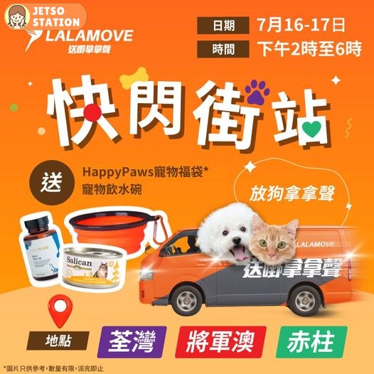 【召集奴才 放狗拿拿聲快閃街站】今個Weekend同主子去邊好?一於去荃灣、將軍澳或者赤柱放電啦!Lalamove放狗拿拿聲快閃街站現場會派發限量寵物飲水碗同寵物食品用品店 Happypaws 嘅寵物零食福袋,仲有Call車優惠碼俾大家,玩完可以輕輕鬆鬆Call車帶毛孩返屋企。
