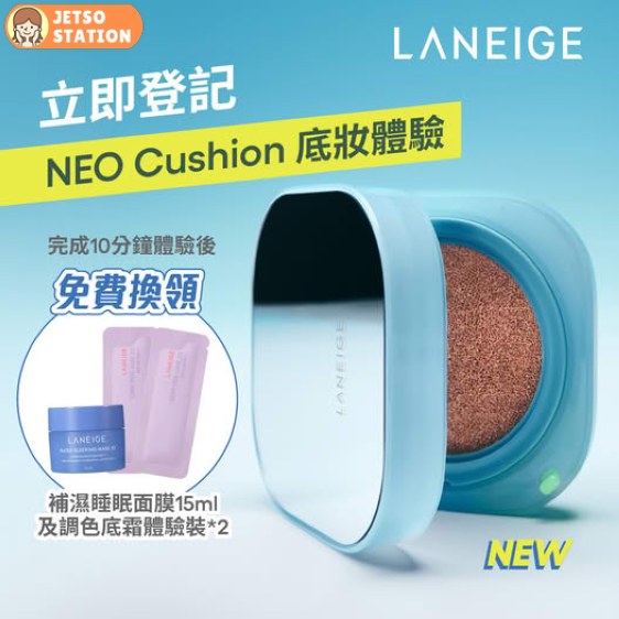 LANEIGE人氣熱賣 NEO Cushion 一直備受好評,啱啱仲推出全新 NEOCushionMewy 輕霧濾鏡貼膚氣墊粉底~喺韓國一開賣就即刻登上Olive Young氣墊粉底第一名!究竟有幾好用?三款 NEO Cushion 邊個先最啱自己?即日起至7月31日,免費登記 LANEIGE NEO Cushion 10分鐘底妝體驗!,完成後可獲贈「補濕睡眠面膜旅行裝及調色底霜體驗裝*2」乙份