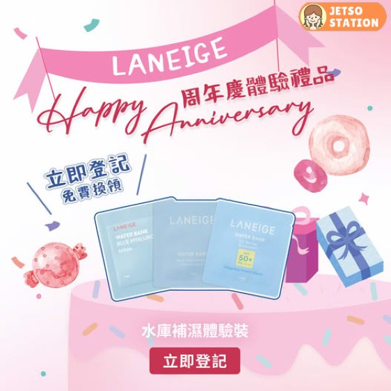 【登記免費換領 周年慶免費禮品】同你一齊慶祝LANEIGE品牌周年慶~立即登記,即可免費換領 「水庫補濕體驗裝」乙份!換領禮品同時即場購買任何產品, 額外再送第一代緊顏細膚水/乳液增量旅行裝50ml!