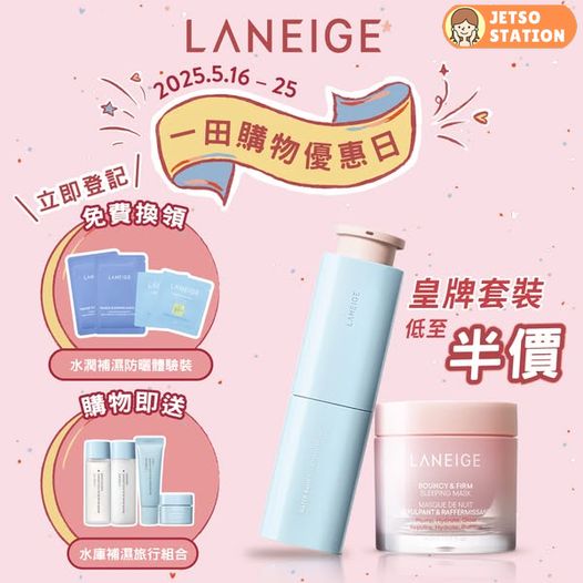 【LANEIGE x 一田購物日 皇牌套裝低至半價 】登記免費換領護膚體驗裝,購物再送水庫補濕4件旅行裝!!
