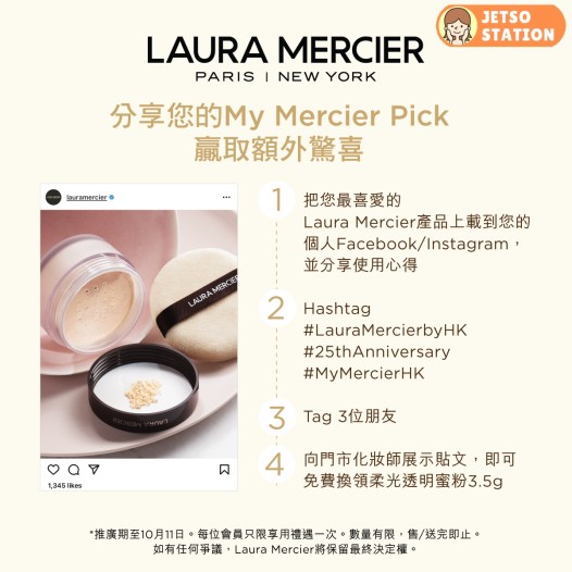 2.於帖文或限時動態加上#LauraMercierbyHK #25thAnniversary #MyMercierHK