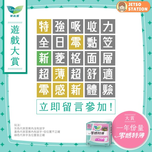 想體驗新版本嘅您,就要參加我哋嘅有獎遊戲!只要跟住以下3步參加遊戲,留言答啱問題而分享又係最有共鳴嘅10位幸運兒,就有機會獲得近一年份量嘅零感特薄(6包樂而雅零感特薄日用22.5cm、10包樂而雅零感特薄特長日用25cm及13包樂而雅零感特薄超特長夜用40cm)!
