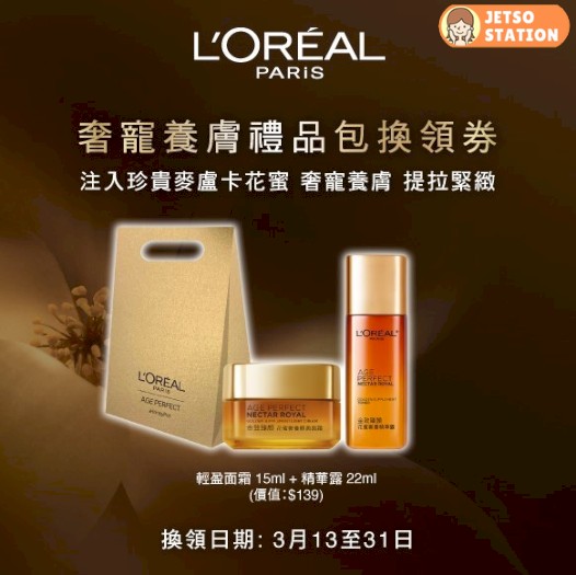 禮品包包括:L’OREAL PARiS 花蜜奢養輕盈面霜15 ml +花蜜奢養精華露22ml 各一支