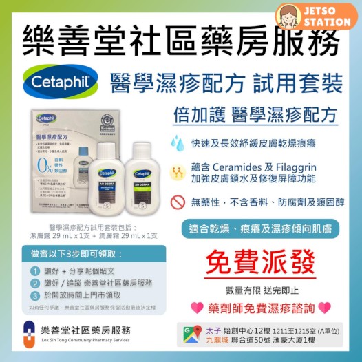 夏天又嚟啦,出汗up住up住導致皮膚問題,濕疹又發作? 樂善堂社區藥房服務的藥劑師為有乾燥皮膚或飽受濕疹困擾嘅你準備咗第3彈嘅舒特膚 Cetaphil PRO AD Derma 醫學濕疹配方試用套裝,有興趣想試就快啲上嚟啦! Cetaphil PRO AD Derma醫學濕疹配方試用套裝包括: