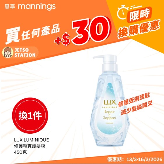 加$30 換👉🏻LUX LUMINIQUE 修護輕爽護髮膜450克^^