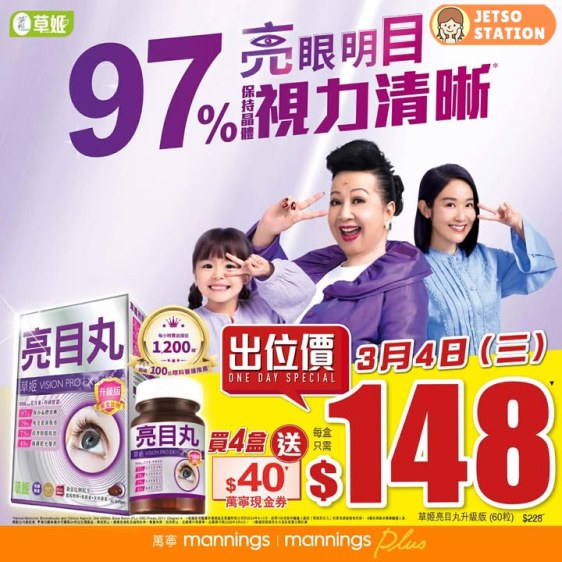 【草姬亮目丸升級版】於3月4日(星期三) 喺萬寧做出位價$1 4 8/盒▼ (原價: $228),低至65折😍優惠只限 1 天!全年最抵! 記得去萬寧搶購啦!