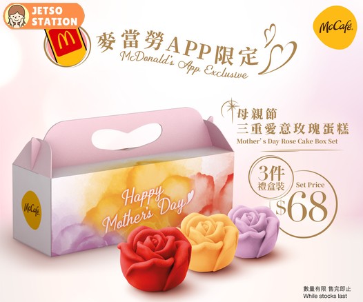 5月5日至8日期間用麥當勞App 獨家Coupon買「McCafé三重愛意玫瑰禮盒裝」蛋糕(玫瑰蜜桃味+香橙朱古力味+雙重藍莓味),