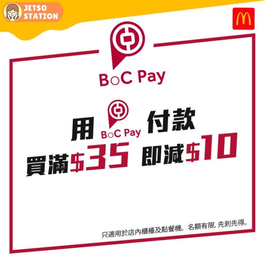 憑BoC Pay於麥當勞單一消費HK$35或以上即減HK$10