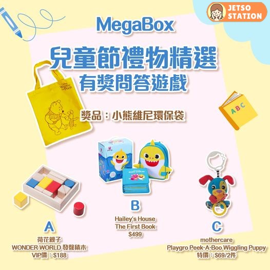 【MegaBox 兒童節禮物精選 有獎遊戲 】送你小熊維尼環保袋!下星期就係兒童節啦,各位家長諗好送咩禮物俾小朋友未呢?小編都苦惱緊同樣問題,喺 MegaBox 咁多間兒童用品商戶中,揀咗 3 件禮物,你哋又覺得邊件最適合送俾小朋友呢?