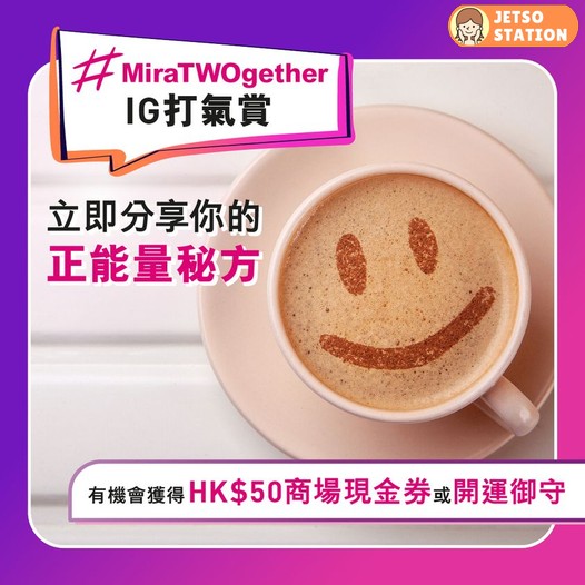 【MiraTWOgether 賞你打氣】Mira Place商場特設「IG打氣賞」向社會傳遞快樂,透過Mira Place 限時動態或Story Highlight參與「正能量日常」Add Yours活動。按“Add Yours/輪到你了”分享你的正能量秘方,並標籤@miraplacehk 及#MiraTWOgether,即有機會獲得HK$50商場現金券或開運御守。詳情可留意Mira Place Facebook及IG公佈。