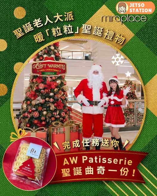 喺指定日子,聖誕老人將會嚟到 Mira Place 暖「粒粒」聖誕樂園同大家見面!完成簡單小任務 (登記成爲 Mi+ 會員及追蹤指定社交平台),仲可以即場獲得 AW Patisserie 聖誕曲奇一份*!記低日子,約定你嚟 Mira Place 同聖誕老人相遇,一齊分享節日溫暖!