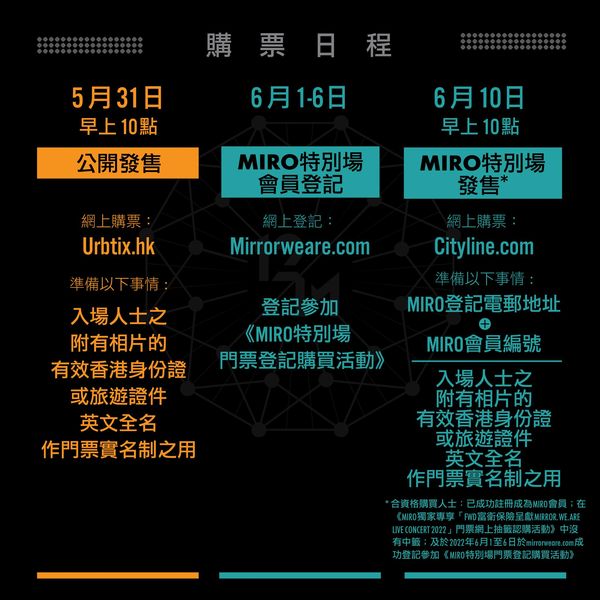 合資格人士可於2022年6月10日早上10時起透過Cityline指定網站(https://mirofans.cityline.com),憑MIRO會員號碼及MIRO登記電郵地址購買演唱會MIRO特別場門票 。