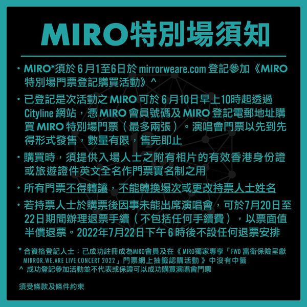 (iii) 須於2022年6月1日中午12時至2022年6月6日晚上11時59分內於mirrorweare.com成功登記參加《 MIRO特別場門票登記購買活動》。每個MIRO會籍只可登記本活動一次,不能重複登記。成功登記參加本活動並不代表或保證可以成功購買演唱會門票。