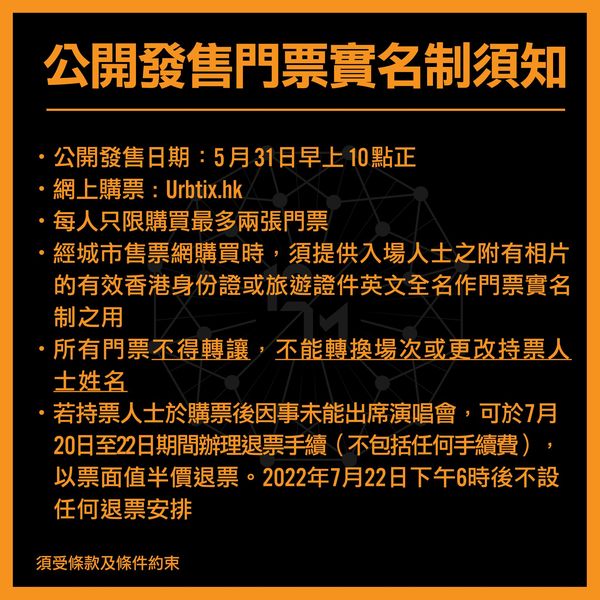 – 若持票人士於購票後因事未能出席演唱會,可於7月20日至22日期間帶同門票前往Cityline辦事處(辦公時間:星期一至五上午9時至下午1時及下午2時至6時)辦理退票手續(不包括任何手續費),以票面值半價退票。退款將於稍後以劃線支票方式寄回退票者。2022年7月22日下午6時後不設任何退票安排。退票詳情稍後會於Cityline網站公佈。