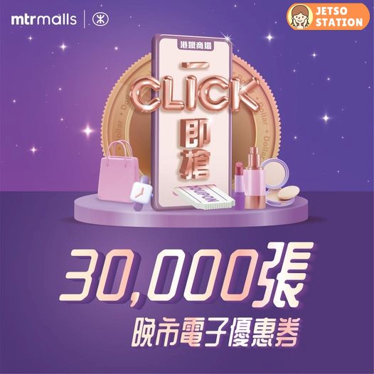 港鐵商場快閃「一 Click 即搶」活動返嚟喇!為響應政府「香港夜繽紛」活動,鼓勵夜間消費,港鐵將於下周推出「一 Click 即搶· 愈夜愈精彩」,免費送出30,000張價值HK$100的港鐵商場電子優惠券。每張電子優惠券消費滿HK$300 可作HK$100 使用。電子優惠券須於2023年10月31日或之前使用並只適用於有效期内晚上 9時後使用。餐飲、休閒消遣、或購物可享低至 67 折優惠。