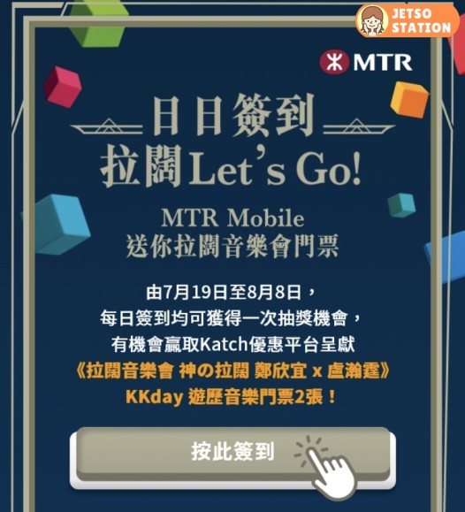 抽獎詳情:由7月19日至8月8日,登入MTR Mobile 指定頁面,每日簽到均可獲得一次抽獎機會,有機會贏取拉闊音樂會門票2張!簽到日數越多,自然中獎機會越大!
