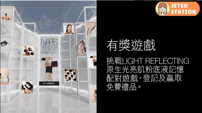 立即到NARS原生光虛擬體驗館,探索LIGHT REFLECTING原生光亮肌粉底液的秘密。挑戰記憶配對遊戲,即可獲贈精美禮品。