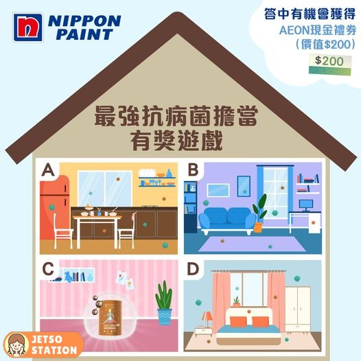 【最強抗病菌擔當有獎遊戲 答中有機會獲得$200 AEON現金禮券】立邦抗病毒淨味兒童漆PRO 採用銅離子抗病毒,有效殺滅99.9%新冠狀病毒及抵禦22種細菌霉菌,全面保護小朋友,稱得上為最強抗病菌擔當。而家就考下你,知唔知圖中邊一間房係用咗立邦抗病毒淨味兒童漆PRO?搵出答案,再留言分享你係邊方面嘅最強擔當!答案正確而個分享最有創意嘅,有機會獲得$200 AEON現金禮券(名額10位)!快啲叫埋身邊嘅朋友仔參加啦!
