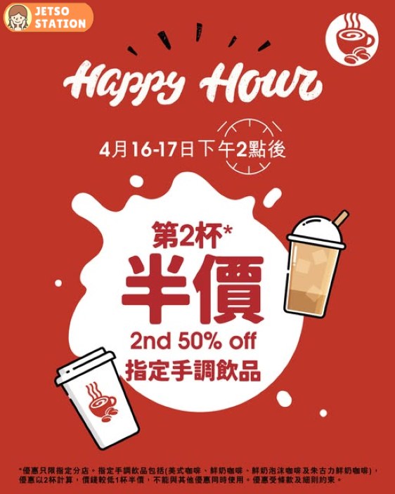 冇錯,你冇睇錯!4月16號至17號,下晝 2 點後,指定飲品有第二杯半價優惠*只限2日!