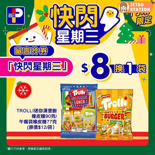 聖誕前夕嚟臨,我哋都想同大家一齊分享節日喜悅!今個快閃星期三,我哋準備咗超可愛嘅Trolli軟糖畀大家過聖誕!有迷你漢堡飽橡皮糖90克同埋午餐袋橡皮糖77克,造型超級可愛,色彩繽紛,食落軟軟QQ,啱晒大人細路!