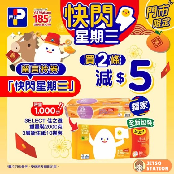 又到超多驚喜優惠嘅星期三,#佳蛋仔BESTGUY 同 #百便星EASY 為各位佳坊誠意推介!全新包裝 佳之選 重量裝2000克3層衛生紙10卷裝,等佳蛋仔呵護住大家過新一年!而家立即留言拎券,買2條 佳之選 重量裝2000克3層衛生紙10卷裝 減$5!限量1000份手快有手慢冇!