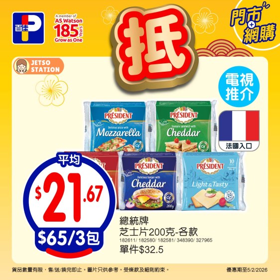 – 總統牌芝士片200克 – 各款,$65/3包,平均$21.67/包*