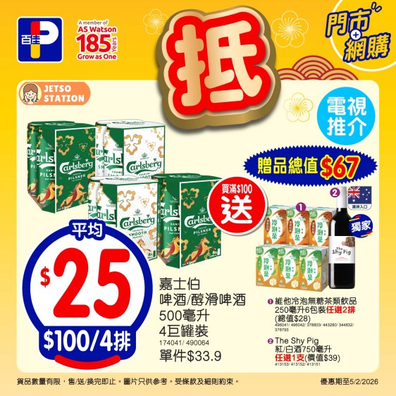*優惠至5/2/2026。以上優惠適用於大部分香港百佳、FUSION、TASTE、INTERNATIONAL 有售,並不適用於百佳旗下的其他超市品牌、數碼港商場 3 樓、百佳快閃特賣埸及新鮮食品優惠並不適用於 TASTE x FRESH 新鮮生活之店舖。貨品數量有限,售/送/換完即止。圖片只供參考。受條款及細則約束。以每張發票計算。 # 原箱優惠/贈品/換購品除外