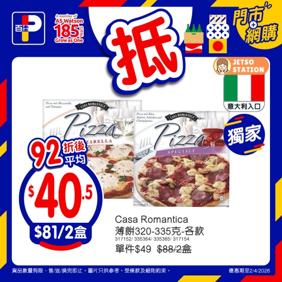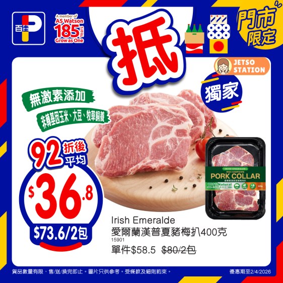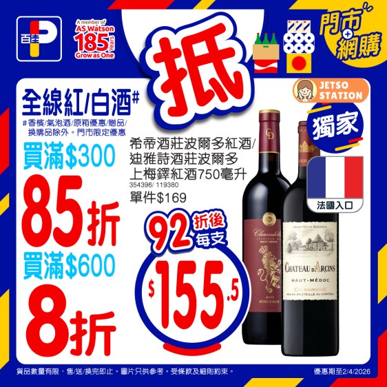 *優惠期至2/4/2026。以上優惠適用於大部分香港百佳、FUSION、TASTE、INTERNATIONAL 及 PNS 網購有售,並不適用於百佳旗下的其他超市品牌、數碼港商場 3 樓、百佳快閃特賣埸及新鮮食品優惠並不適用於 TASTE x FRESH 新鮮生活之店舖。貨品數量有限,售/送/換完即止。圖片只供參考。受條款及細則約束。以每張發票計算。 #原箱優惠/贈品/換購品除外