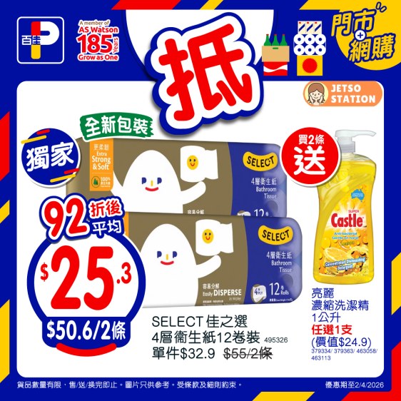 – SELECT佳之選4層衛生紙12卷裝 – 92折後價: $50.6/2條