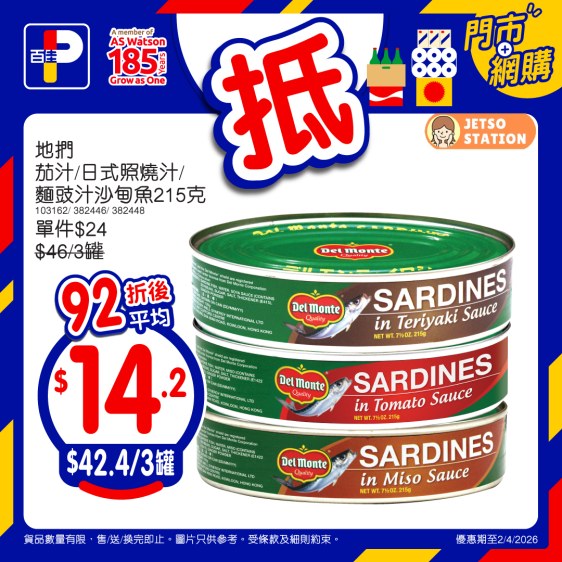 – 地捫茄汁/日式照燒汁/麵豉汁沙甸魚215克 – 92折後價: $42.4/3罐