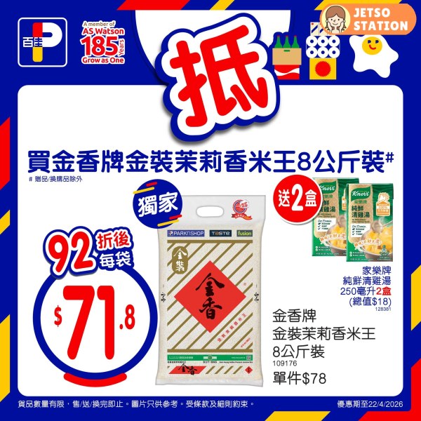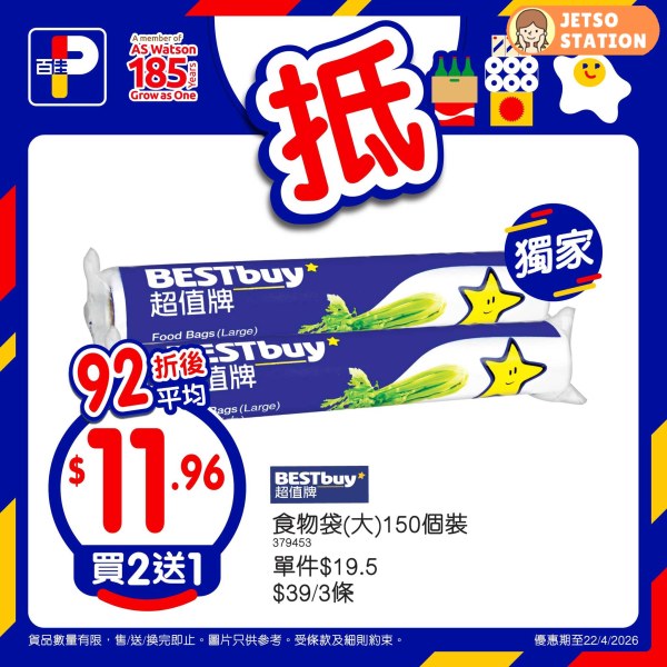 *優惠期至22/4/2026。以上優惠適用於大部分香港百佳、FUSION、TASTE、INTERNATIONAL 及 PNS 網購有售,並不適用於百佳旗下的其他超市品牌、數碼港商場 3 樓、百佳快閃特賣埸及新鮮食品優惠並不適用於 TASTE x FRESH 新鮮生活之店舖。貨品數量有限,售/送/換完即止。圖片只供參考。受條款及細則約束。以每張發票計算。 #原箱優惠/贈品/換購品除外