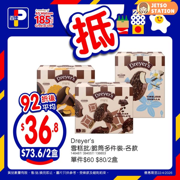 – Dreyer’s雪糕批/脆筒多件裝 -各款 – 92折後價: $73.6/2盒