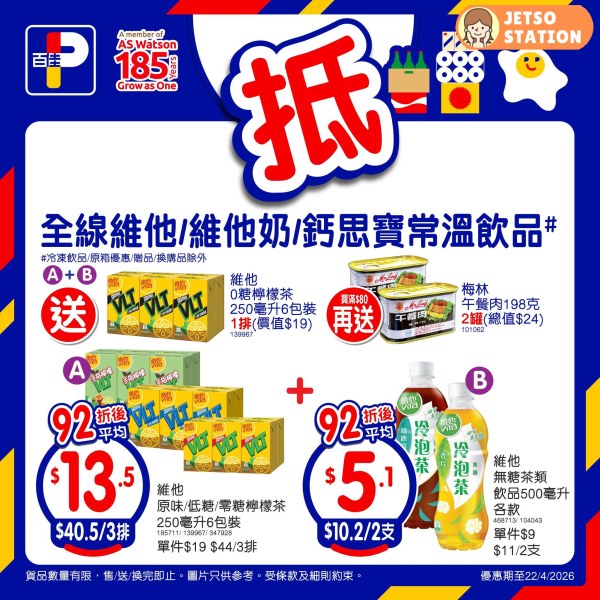 – 買全線維他/維他奶/鈣思寶常溫飲品組合送維他0糖檸檬茶250毫升6包裝1排,滿$80再送梅林午餐肉198克2罐