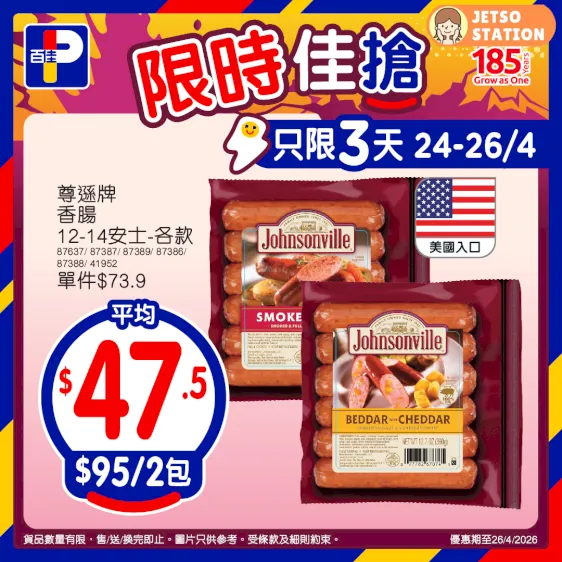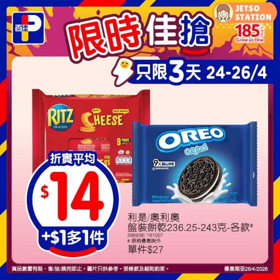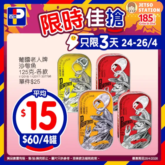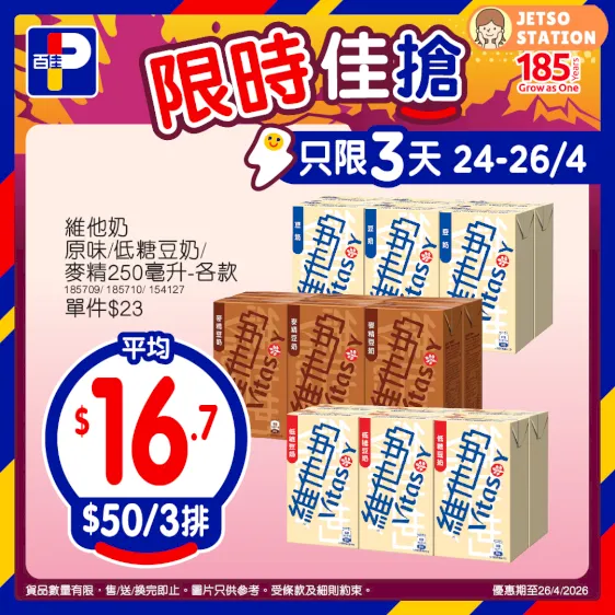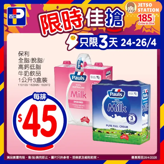 *優惠期至26/4/2026,以上優惠適用於大部分香港百佳、FUSION、TASTE、INTERNATIONAL及PNS網購有售,並不適用於百佳旗下的其他超市品牌、百佳快閃特賣埸及新鮮食品優惠並不適用於TASTE x FRESH 新鮮生活之店舖。貨品數量有限,售/送/換完即止。圖片只供參考。 受條款及細則約束。贈品/換購品除外。以每張發票計算。