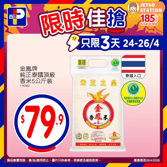 – 金鳳牌純正泰國頂級香米5公斤裝 $79.9/袋*