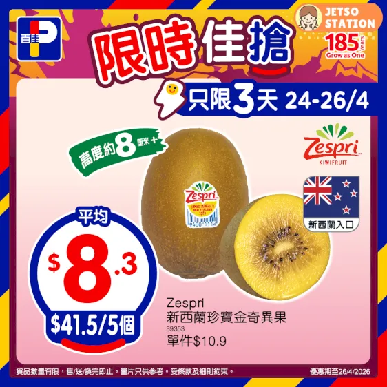 – Zespri 新西蘭珍寶金奇異果 $41.5/5個,平均$8.3/個*