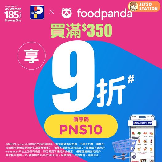 #適用於foodpanda的指定生活百貨訂單,並須買滿$350(不連平台費、運費及其他適用費用並計算折扣及優惠券後);每張訂單最高折扣為$50;優惠或不適用於foodpanda平台上的所有商品,特定商品不適用於此優惠; 優惠僅適用指定用戶,每位帳戶限用一次; 優惠期至2026年3月31日,名額有限,先到先得,送完即止。