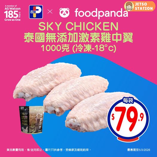 – SKY CHICKEN泰國無添加激素雞中翼1000克(急凍 -18°C),優惠價$79.9/袋