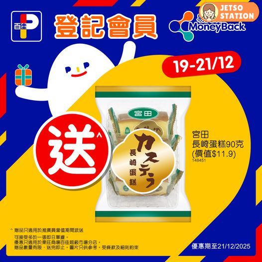 仲未登記做會員? 喺12月19日至12月 21日過嚟百佳登記做會員,仲即送你 👉 宮田 長崎蛋糕90克*