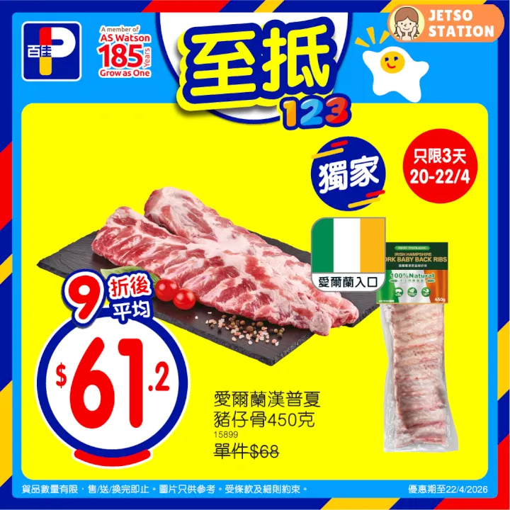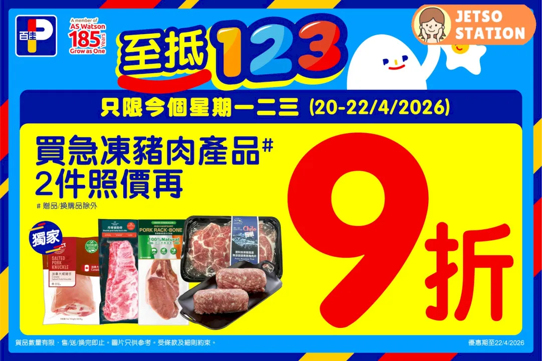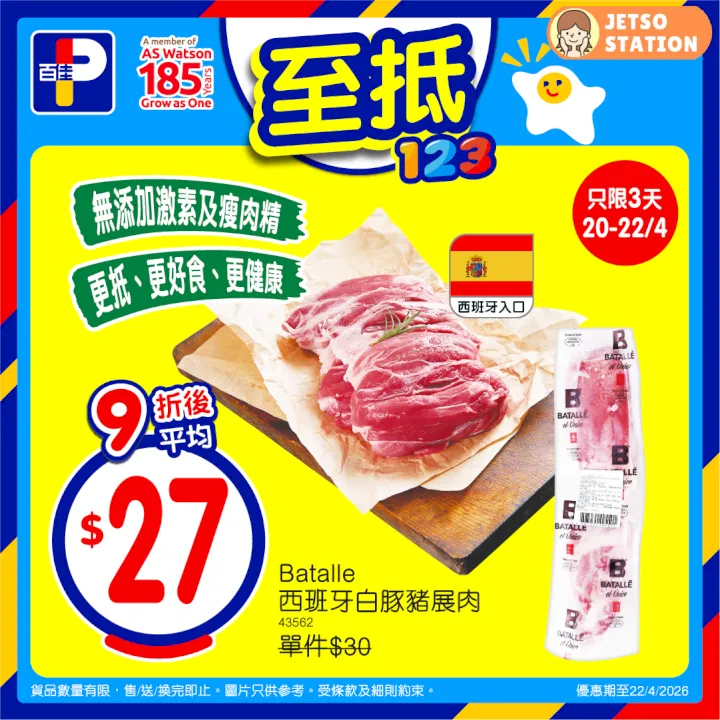 *優惠期至22/4/2026。以上優惠適用於大部分香港百佳、FUSION、TASTE、INTERNATIONAL 及 PNS 網購有售,並不適用於百佳旗下的其他超市品牌、百佳快閃特賣埸。貨品數量有限,售/送/換完即止。圖片只供參考。受條款及細則約束。以每張發票計算。
