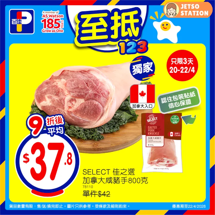 – SELECT 佳之選加拿大咸豬手800克 9折後 $37.8/包*