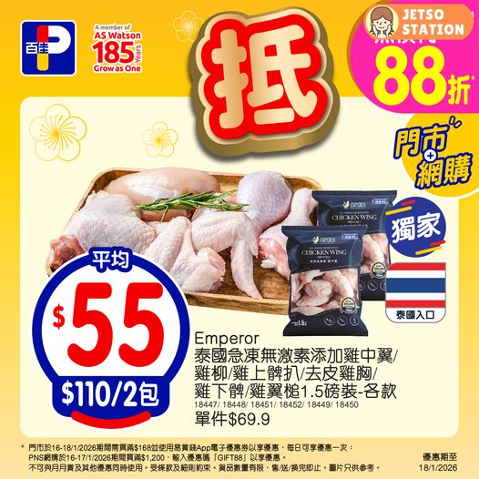 *優惠期至18/1/2026。以上優惠適用於大部分香港百佳、FUSION、TASTE、INTERNATIONAL及PNS網購有售,並不適用於百佳旗下的其他超市品牌、數碼港商場3樓、百佳快閃特賣埸及新鮮食品優惠並不適用於TASTE x FRESH 新鮮生活之店舖。貨品數量有限,售/送/換完即止。圖片只供參考。贈品/換購品除外。以每張發票計算。^需買滿$168並使用易賞錢App電子優惠券以享優惠。每日可享優惠一次。不可與月月賞及其他優惠同時使用。受條款及細則約束。`日本版/北海道小麥版除外
