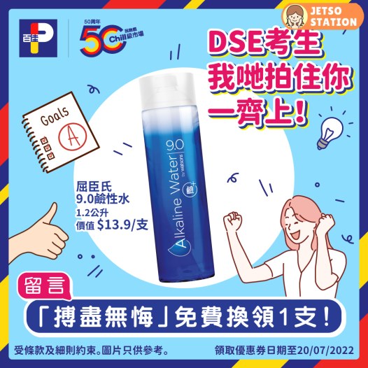 【 DSE考生!我哋拍住你一齊上 】講多無謂,行動最實際!各位DSE考生依家留言「搏盡無悔」,即可獲得優惠券,憑券免費換領 屈臣氏9.0鹼性水1.2公升 1支,優惠券派發時間到今日(20/7)晚上8:00,DSE考生無論考得好唔好,最緊要對得住自己!放心,我哋撐住你!