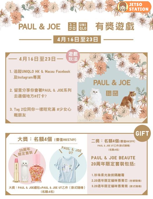 【有獎遊戲 PAUL & JOE BEAUTE (HK) X UNIQLO 誠邀你一齊尋找少女心】全新 Paul & Joe 2022 春夏系列 UT 已經登陸 UNIQLO 啦!今季用咗充滿少女心嘅可愛嘅貓咪及象徵著好運的燕子以及經典菊花圖案, 推出咗 T 恤、連身裙、圍巾、袋及其他配件等!適逢今年係香港 PAUL & JOE BEAUTE 20周年, 今次就同 UNIQLO 聯乘合作推出有獎遊戲,立即跟住下面步驟啦! 答得最有心思嘅 8 位參加者就有機會獲得豐富禮物!